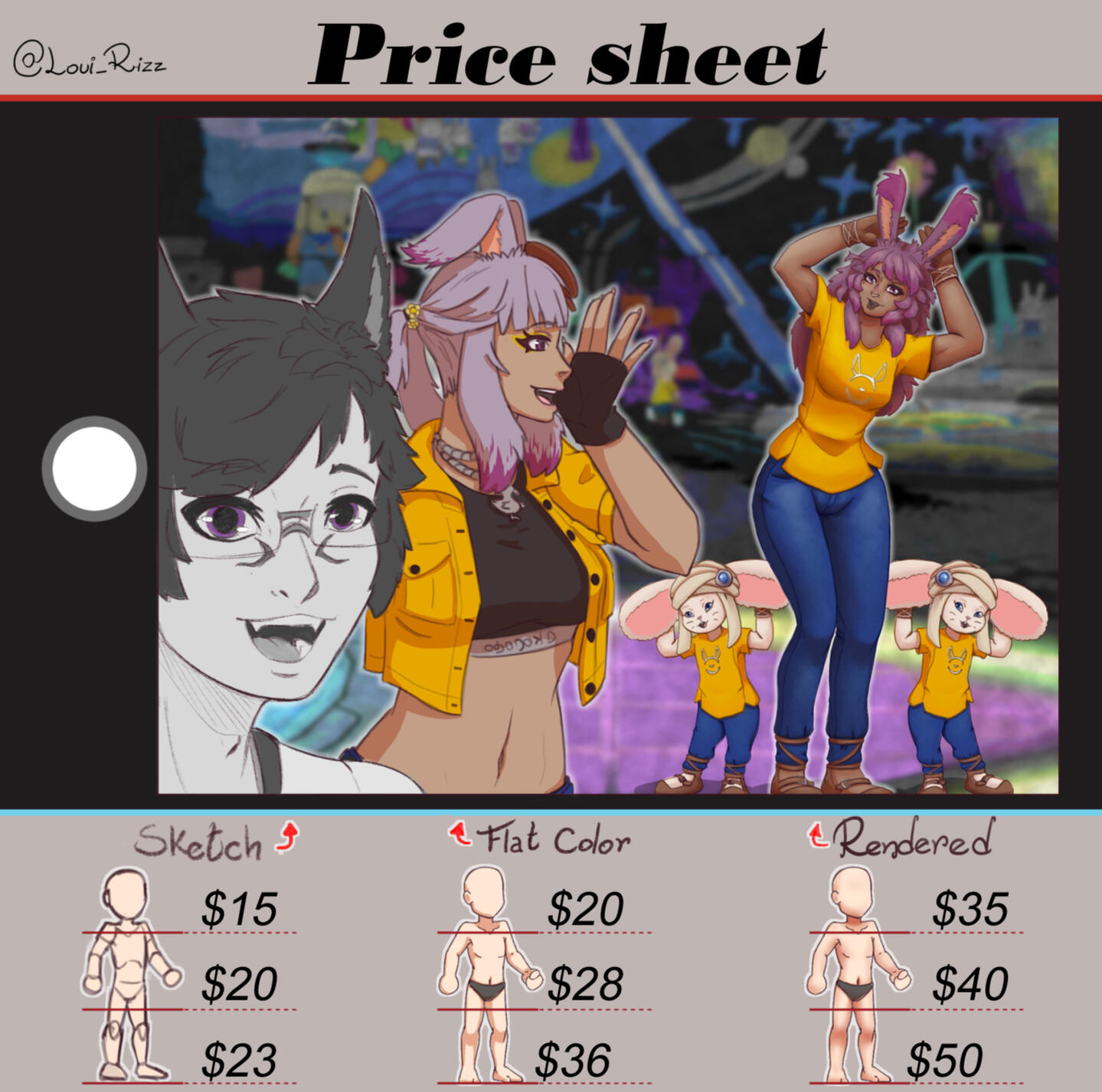Freelancer artist, character designer and OC's enthusiastWelcome and please take a look, if you have any questions about my work you can call me on Twitter or Discord: loui_rizz